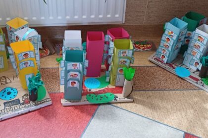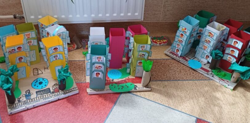 Dzień Ziemi w klasie 0 w tym roku szkolnym wyglądał trochę inaczej. Tym razem dzieci w grupach projektowały miasto, z drzewami, skwerkami i fontannami. Tak pracowały i takie są ich dzieła.