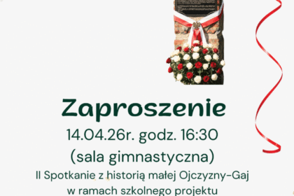 Zapraszamy Wszystkich zainteresowanych mieszkańców Wałbrzycha na II Spotkanie z historią małej Ojczyzny – Gaj, w ramach szkolnego projektu ,,Pamięć Pokoleń’. Tym razem będziemy w dniu 14.04.26r. o godzinie 16.30 , gościć Panią dr hab. Dorotę Sulę z Muzeum Gross-Rosen w … Czytaj więcej