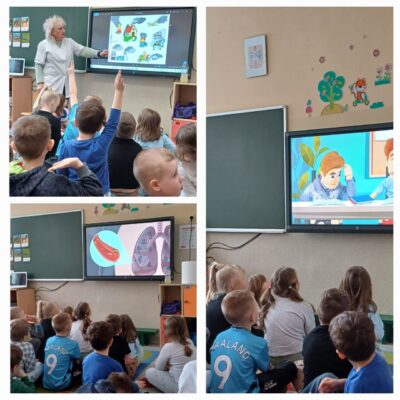 W ramach programu Sanepidu odbyły się w przedszkolu wspólne zajęcia na temat dymu papierosowego. Po rozmowie z pielęgniarką i obejrzeniu filmu edukacyjnego, dzieci zaśpiewały piosenkę o Zielonym Dinku, który jest symbolem tego programu. W każdej grupie wiekowej dzieci wykonały też kolorowanki-Zielonego Dinka. Starszacy wykleili schemat płuc  różową bibułą tworząc plakaty z napisami “Mamo, Tato nie pal przy mnie!” lub ”  Moja rodzina nie pali!”