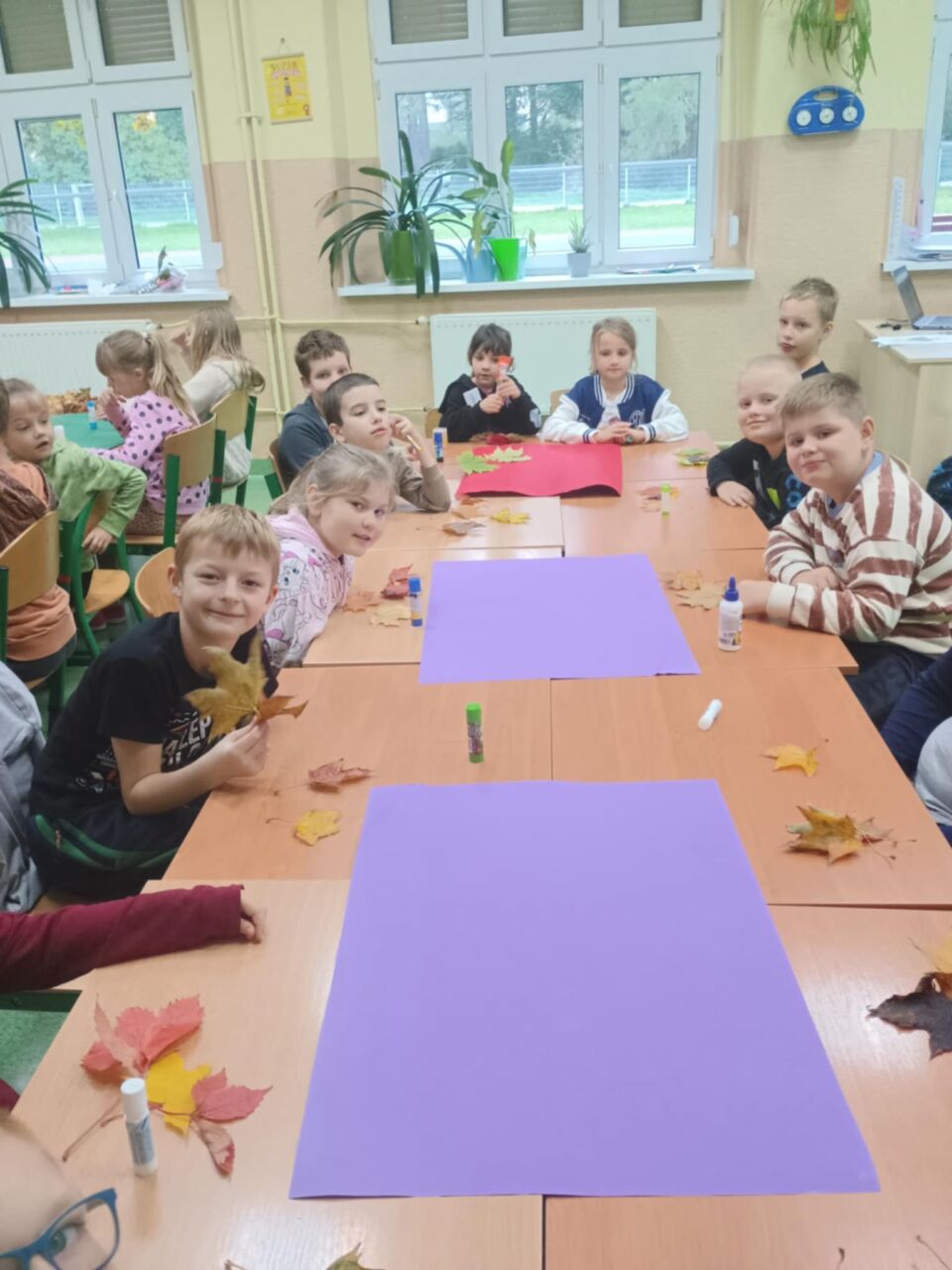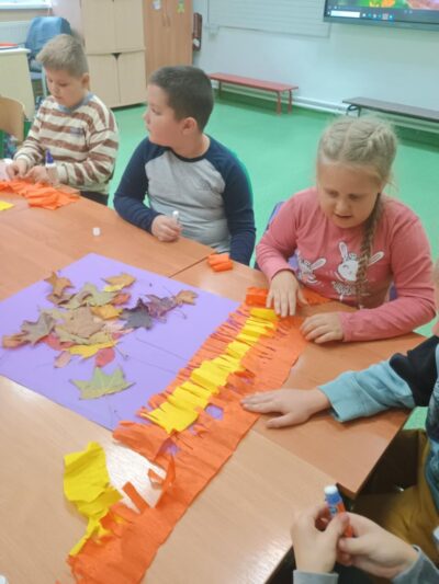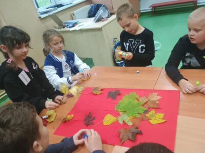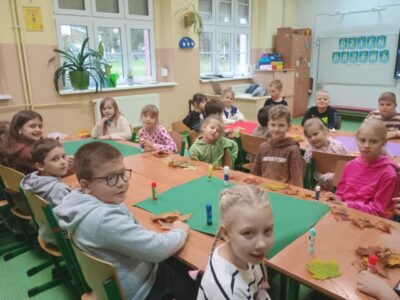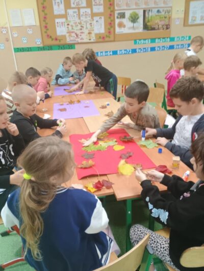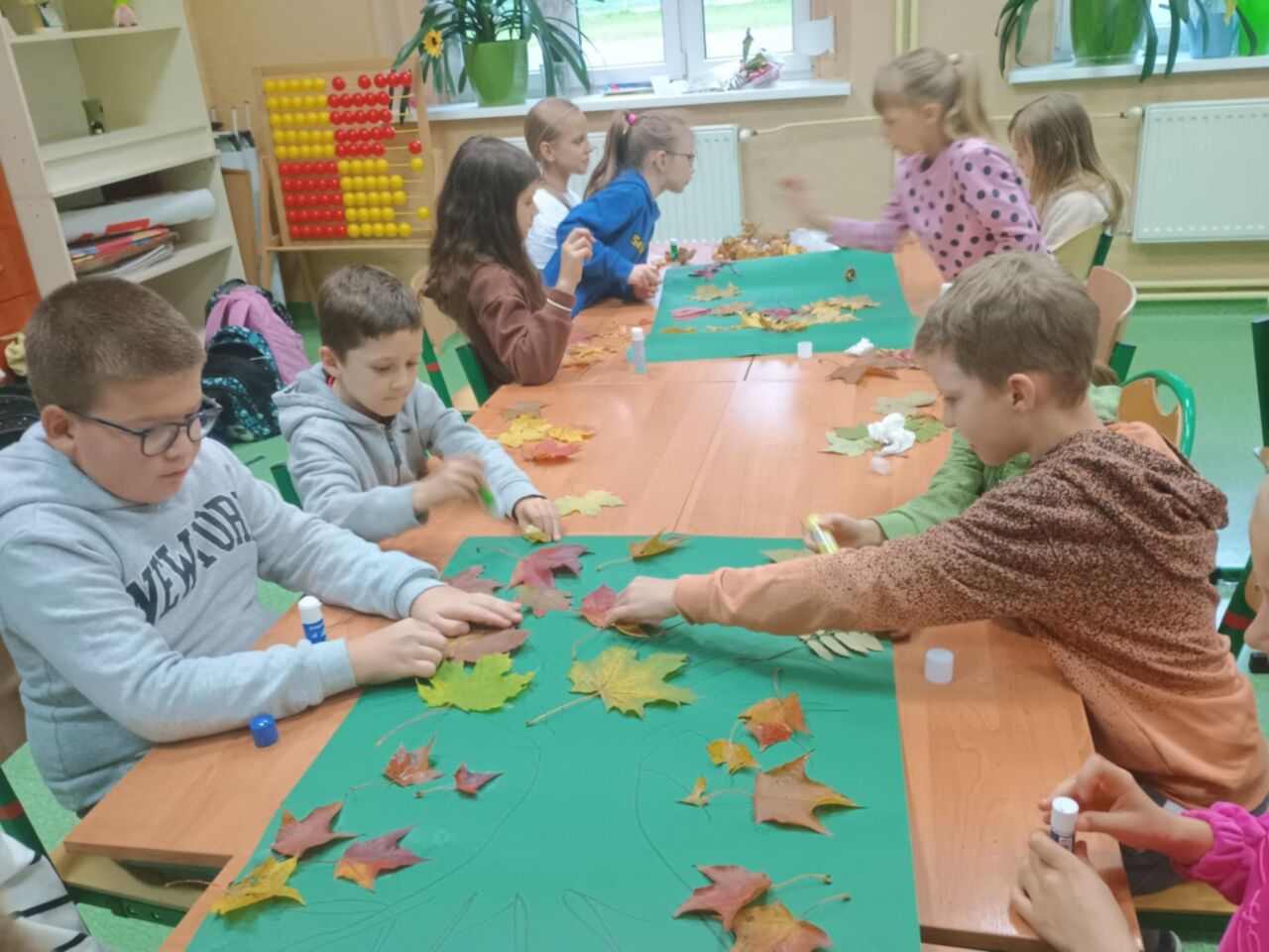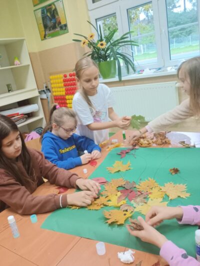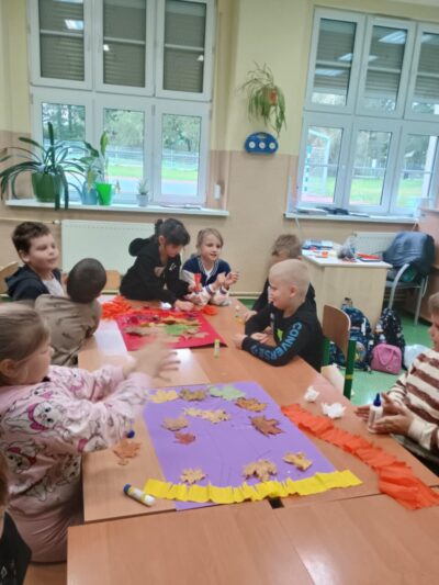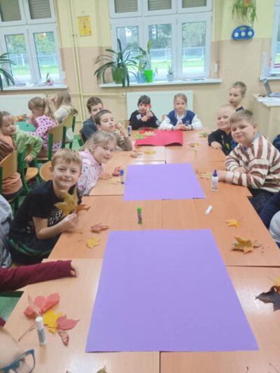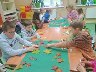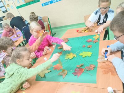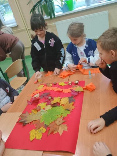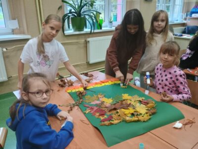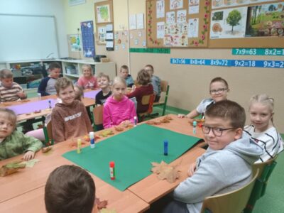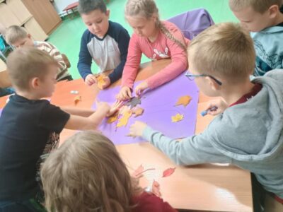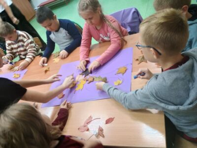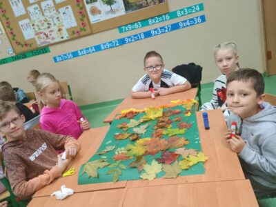 Na zakończenie zajęć uczniowie wykonali wspólną pracę plastyczną – duże drzewa ozdobione naturalnymi liśćmi, które sami wcześniej zebrali. Dzieci z ogromnym zaangażowaniem przyklejały liście, tworząc barwną, jesienną kompozycję.