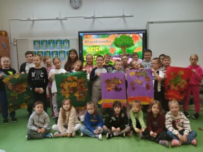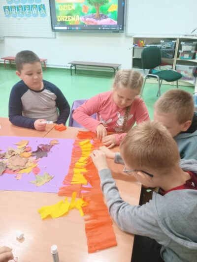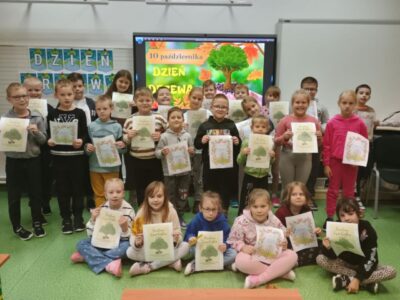 Uczniowie klasy 1 i 3 wzięli udział we wspólnych zajęciach z okazji Dnia Drzewa. Dzieci obejrzały film edukacyjny „Poznajemy drzewa”, dzięki któremu dowiedziały się, jak rozpoznawać różne gatunki drzew po ich liściach, korze i owocach. Następnie uczestniczyły w zabawie rozpoznawania drzew i liści, utrwalając zdobytą wiedzę w praktyce.