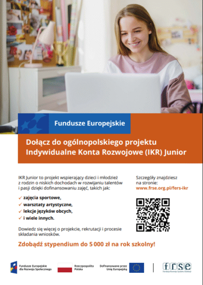 Dołącz do programu Indywidualnych Kont Rozwojowych Junior i zdobądź nawet do 15 tys. zł na rozwój Twoich pasji. Sfinansuj kursy, zajęcia dodatkowe, warsztaty, turnusy rehabilitacyjne i inne inicjatywy, które służą Twojemu rozwojowi. Nabór trwa!