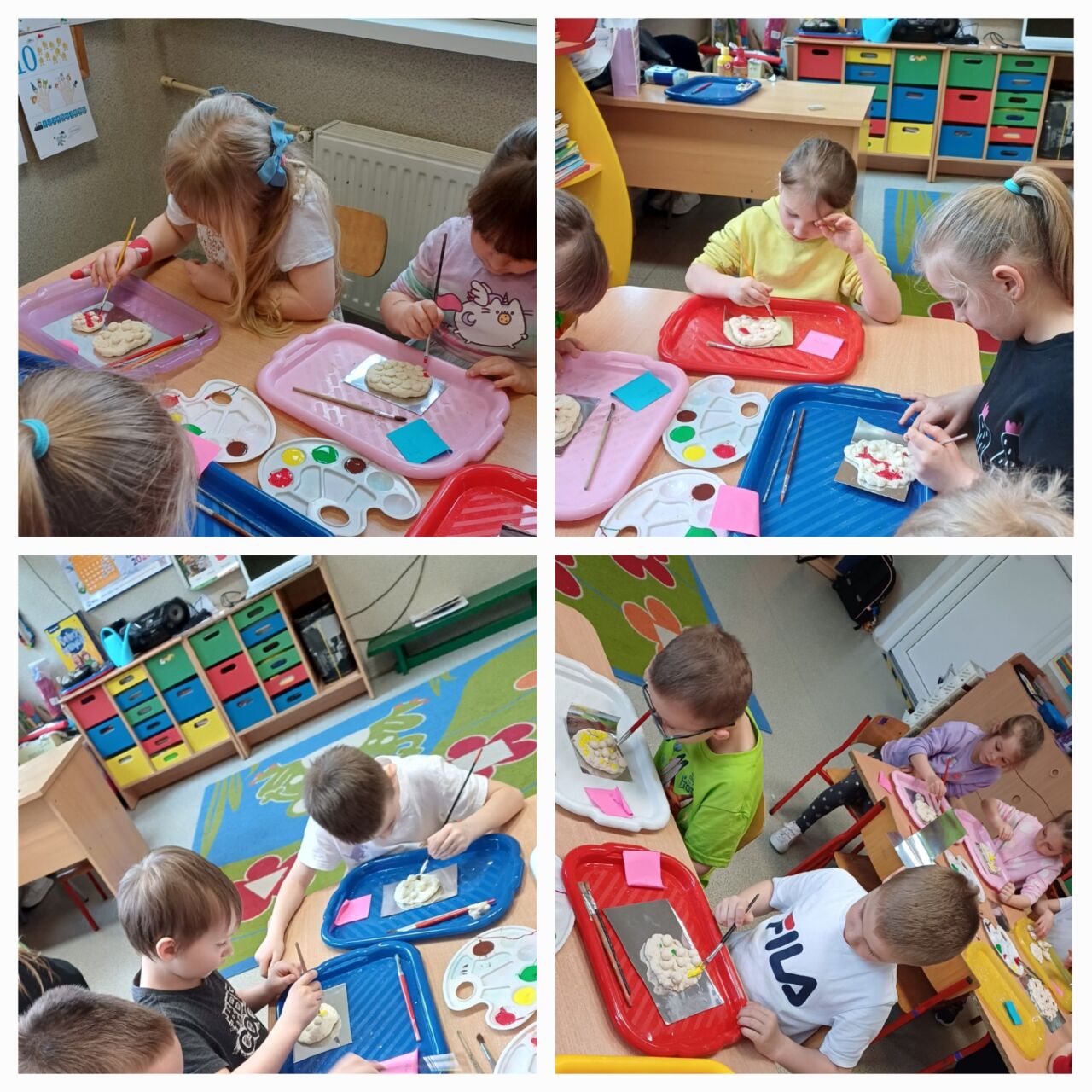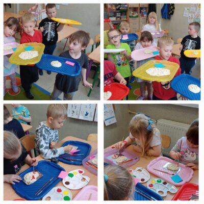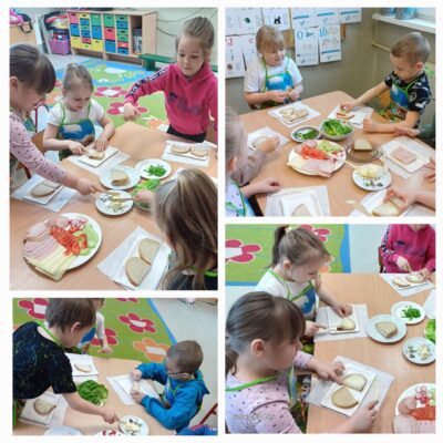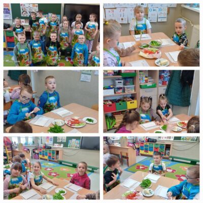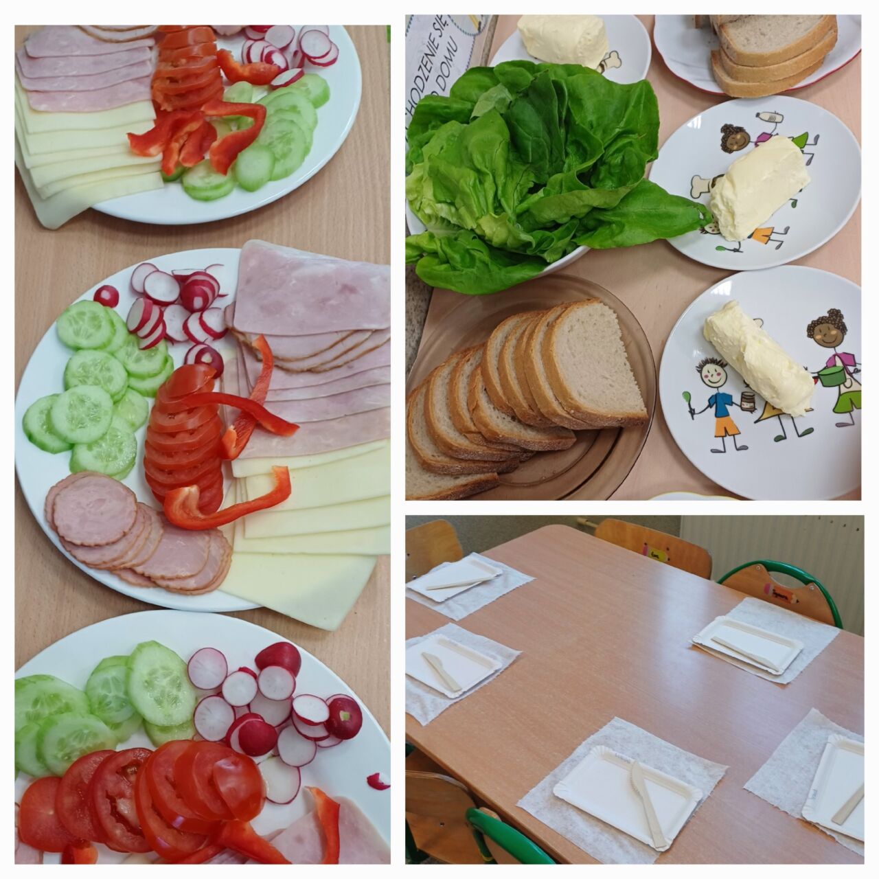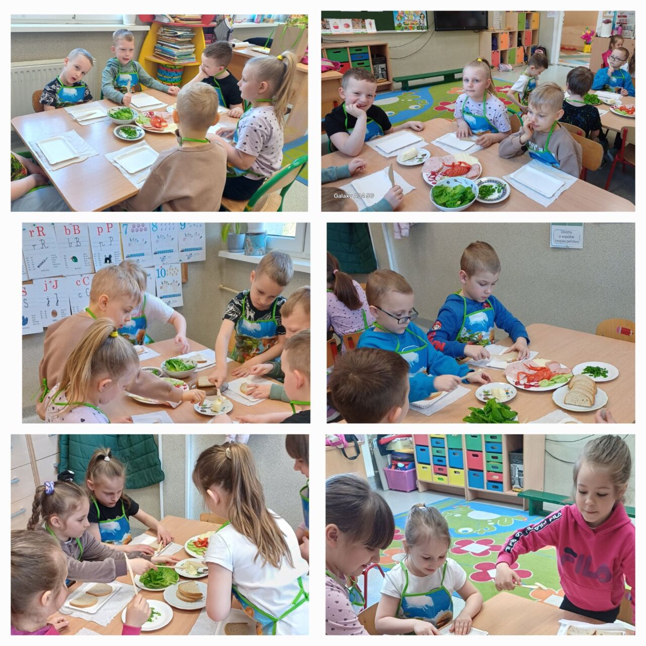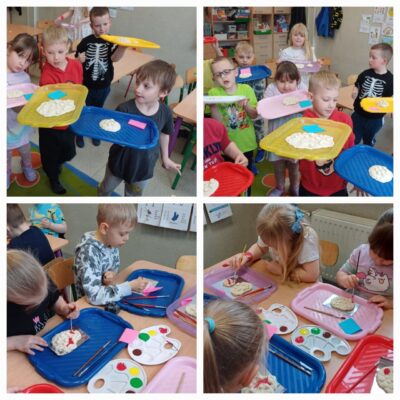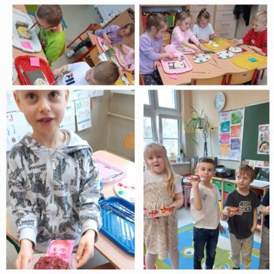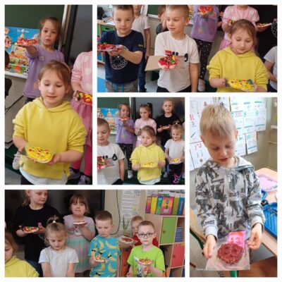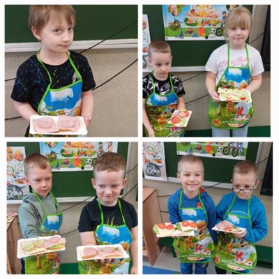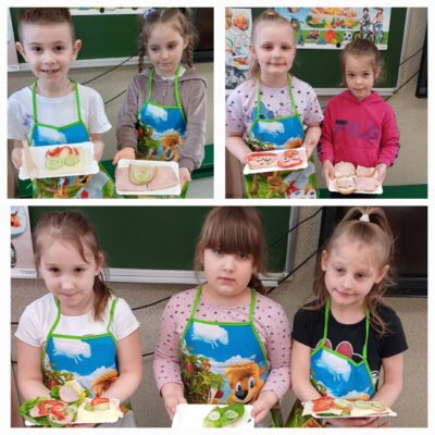 W tym tygodniu dzieci z klasy 0 uczyły się zasad zdrowego żywienia. Elementem, który jest najbardziej lubiany przez dzieci, to prace plastyczne. Dzieci wykonały z masy solnej pizzę,  którą pomalowały farbami. Dla równowagi wykonały samodzielnie zdrowe kanapki z warzywami, wędlina i nabiałem. Niektóre z tych kanapek to małe dzieła.