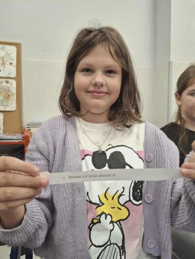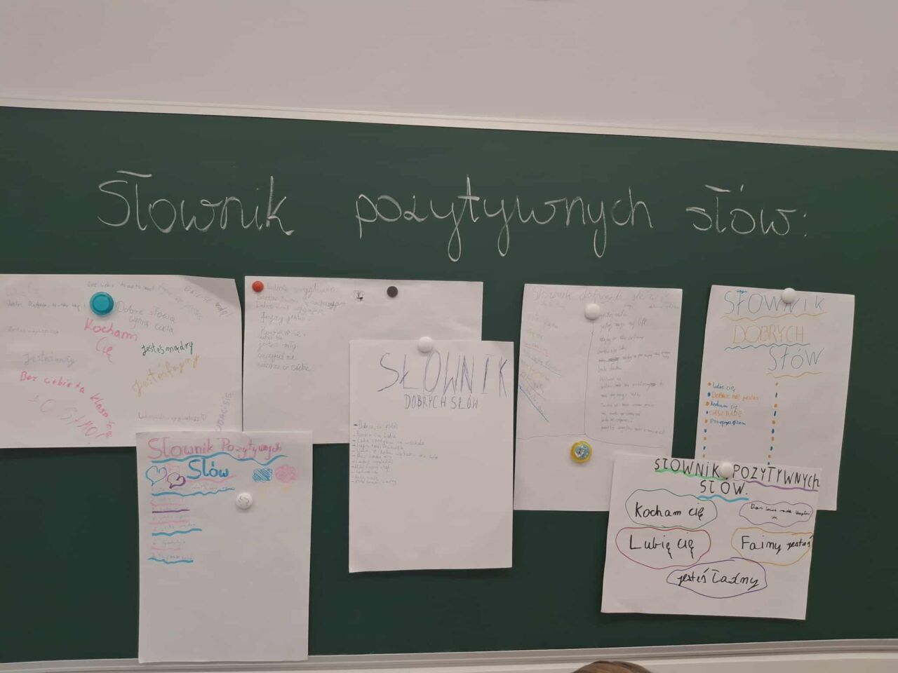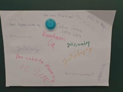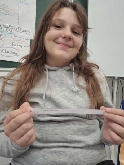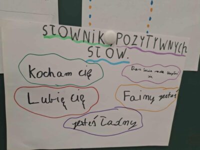 Podczas zajęć uczniowie wykonywali kolorowe plakaty, na których umieszczali inspirujące hasła i pozytywne komunikaty. Był też czas na wzajemne komplementy – dzieci mówiły sobie dobre rzeczy, dzieliły się miłymi obserwacjami i wspólnie tworzyły atmosferę pełną życzliwości.