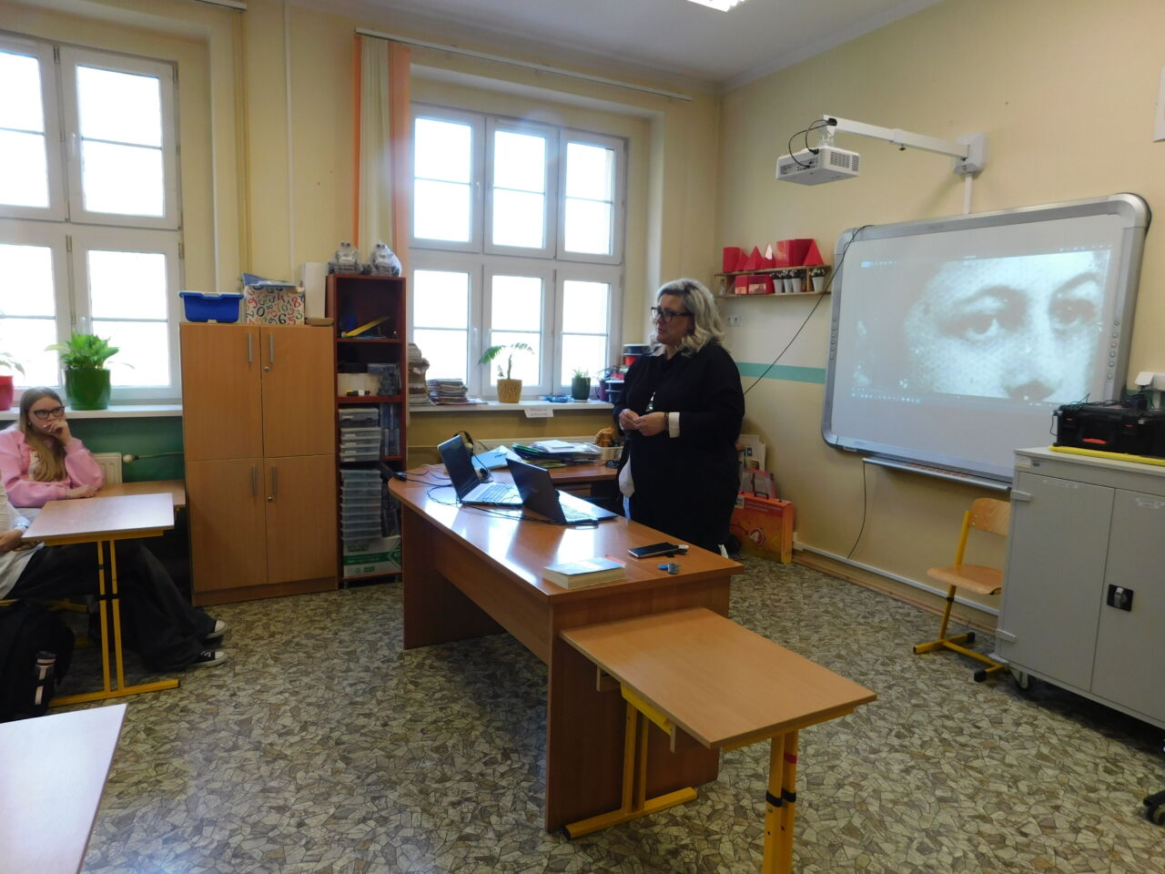 Podczas spotkania autorka przybliżyła uczniom tematykę swoich książek, koncentrując się na historii obozu koncentracyjnego Gross-Rosen oraz losach ludzi, których życie zostało naznaczone dramatem II wojny światowej.
