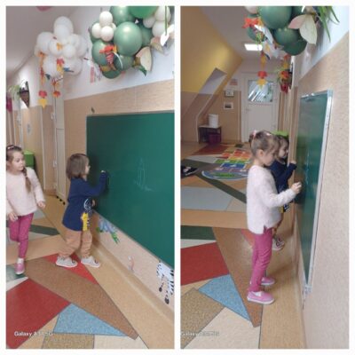 W przedszkolnym holu pojawiła się tablica kredowa. Dzieci chętnie korzystają z niej w porannych i popołudniowych godzinach. Powstają ciekawe rysunki, a przy okazji dzieci ćwiczą swoje umiejętności manualne.
