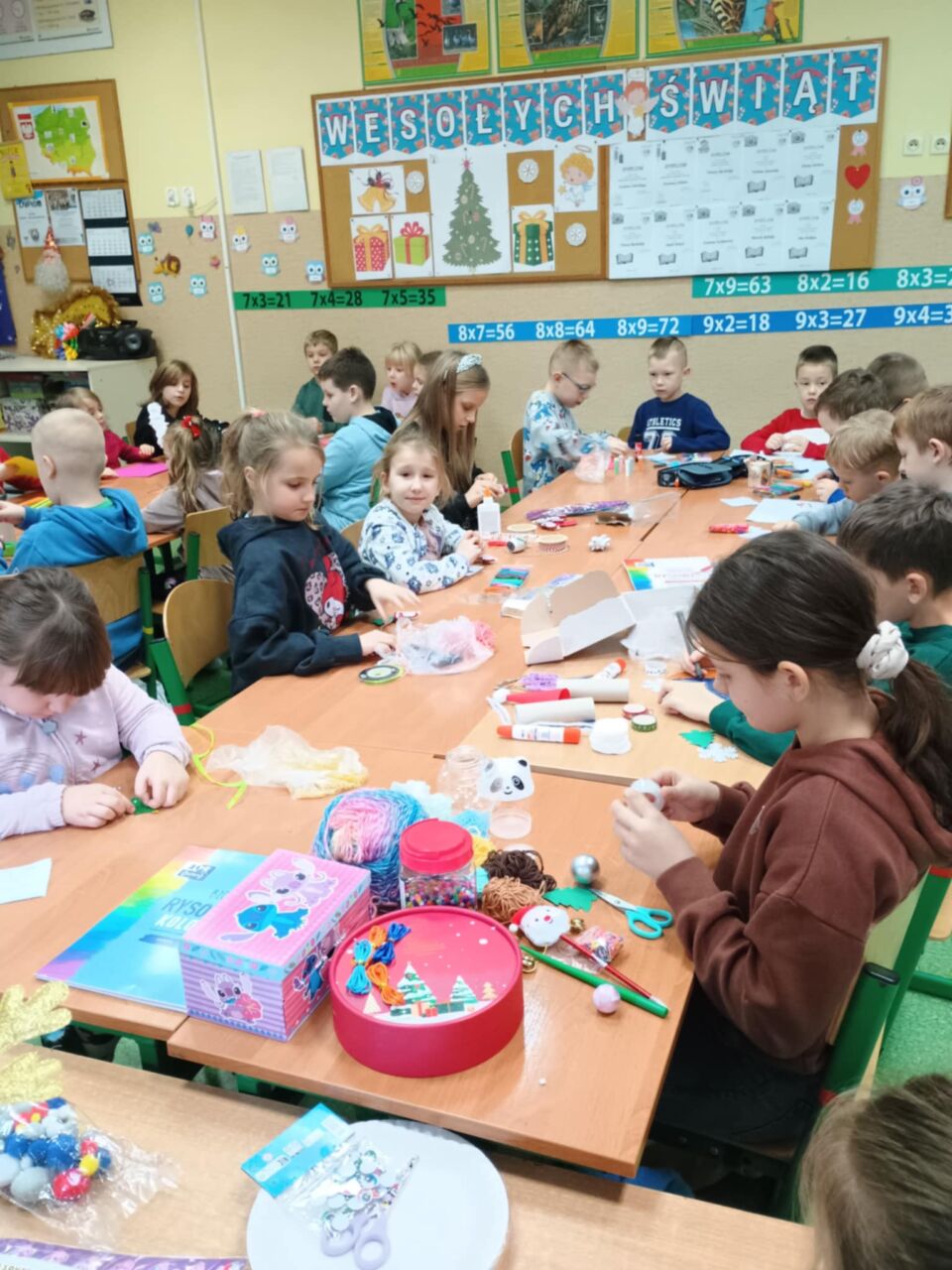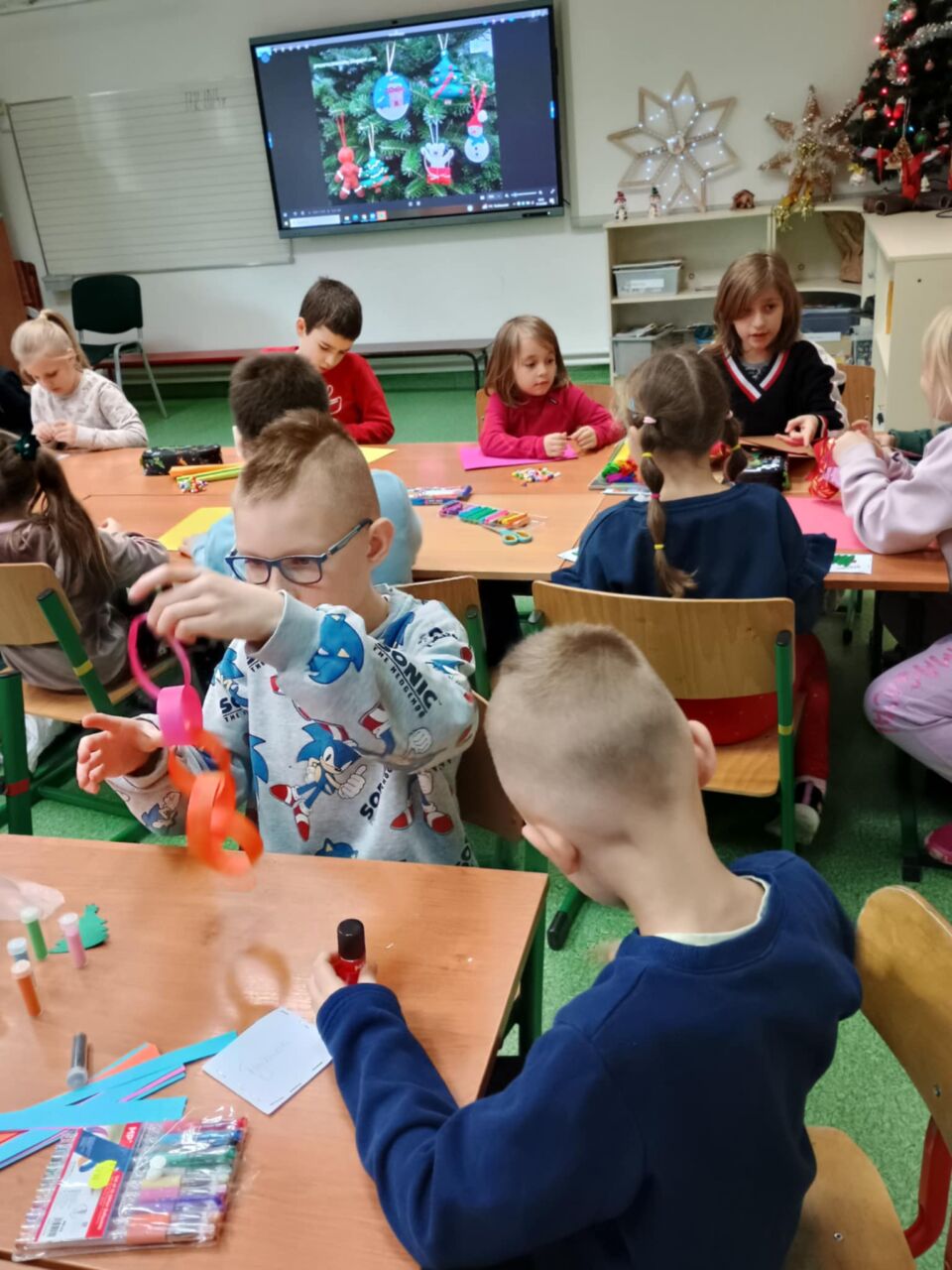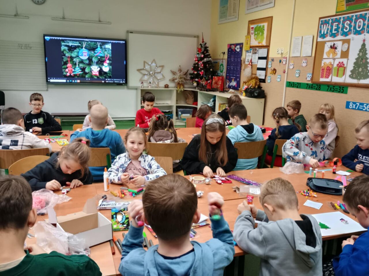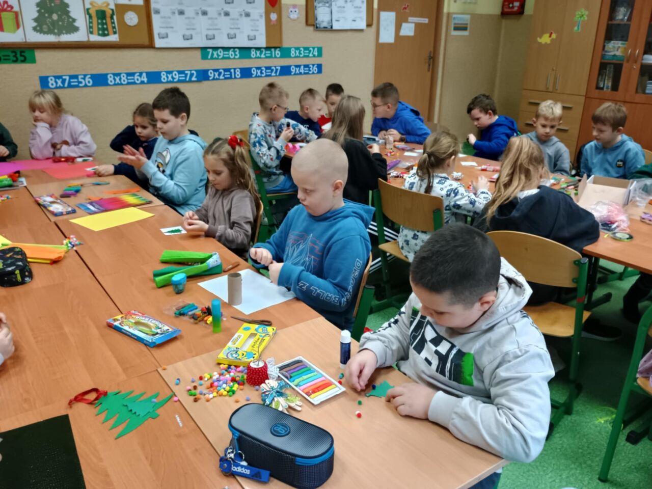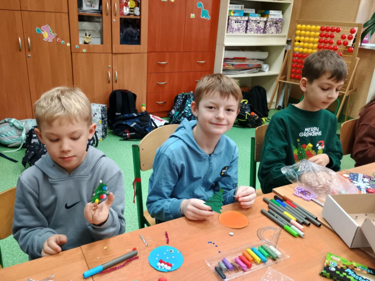 Uczniowie klasy trzeciej wraz z wychowawczynią w ramach programu adaptacyjnego „Witaj w szkole” zaprosili swoich młodszych kolegów i koleżanki do wspólnego wykonania unikalnych ozdób choinkowych z naturalnych materiałów.