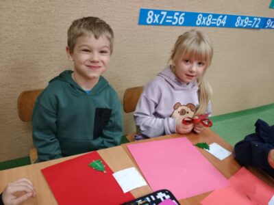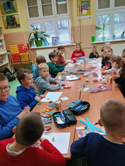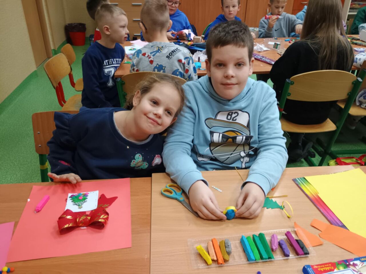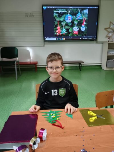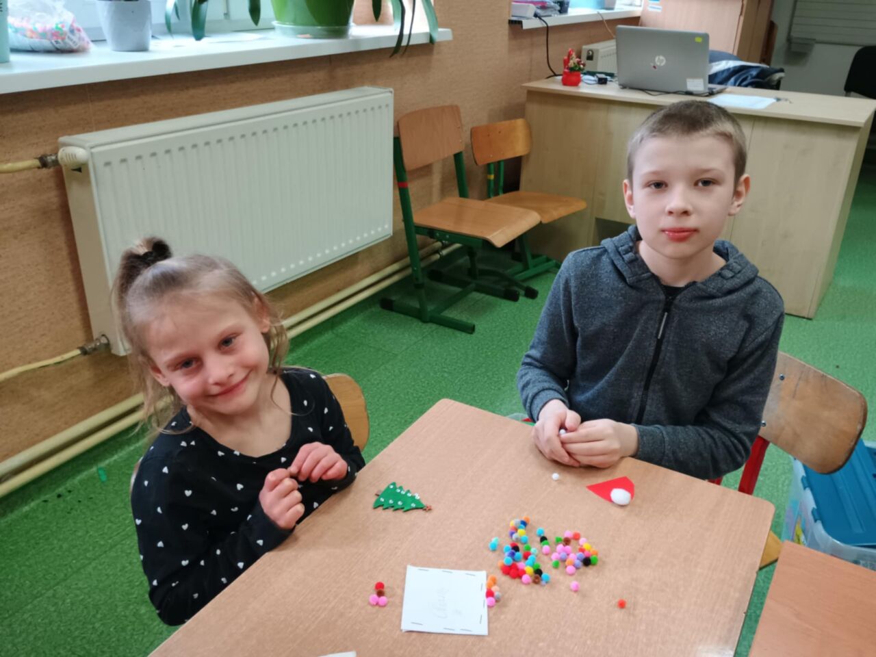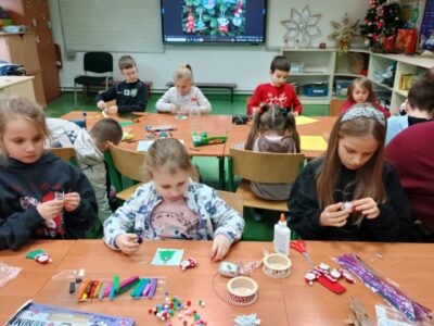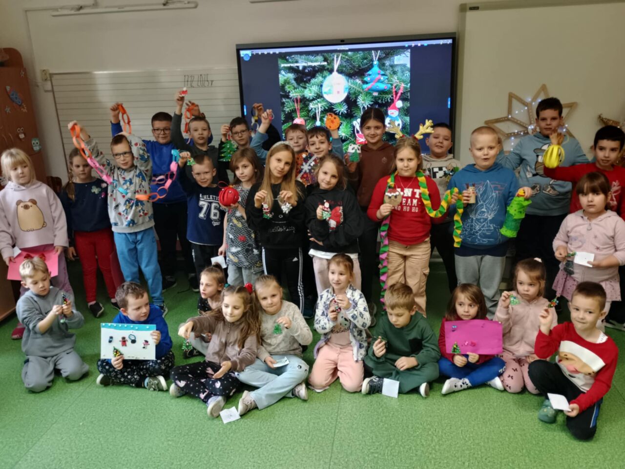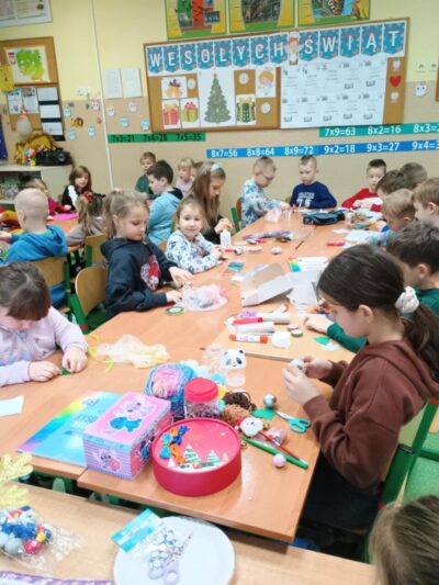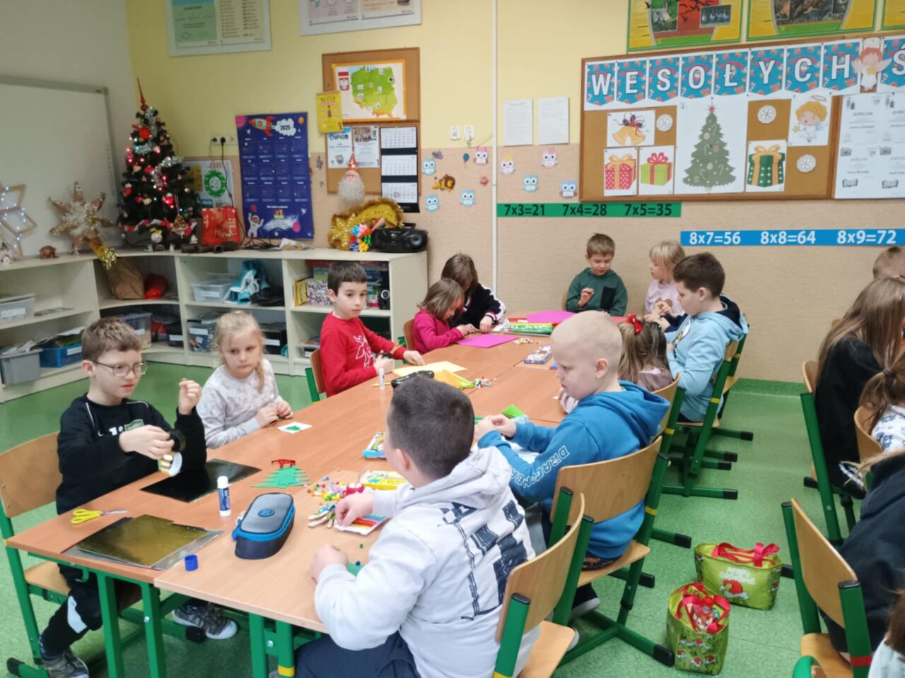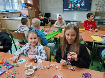 Uczniowie klasy trzeciej wraz z wychowawczynią w ramach programu adaptacyjnego „Witaj w szkole” zaprosili swoich młodszych kolegów i koleżanki do wspólnego wykonania unikalnych ozdób choinkowych z naturalnych materiałów.