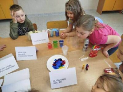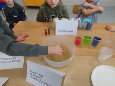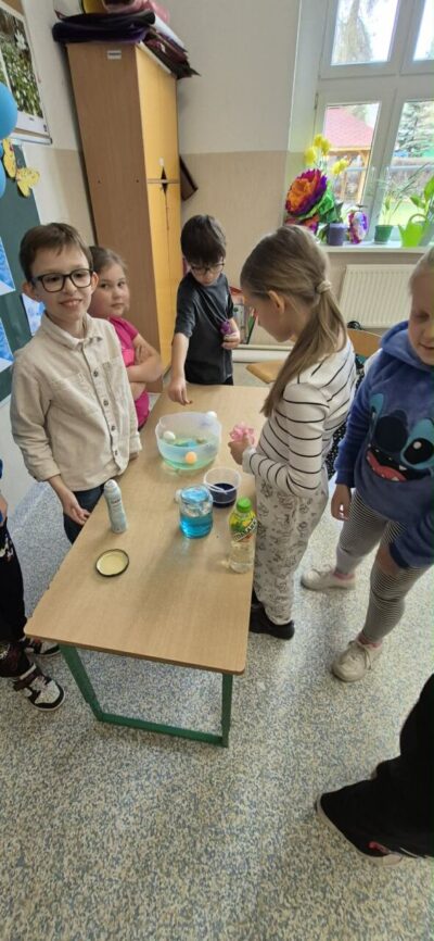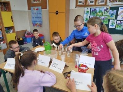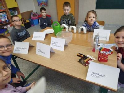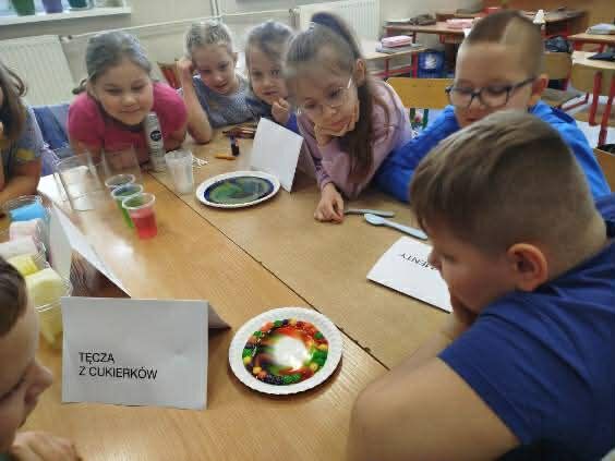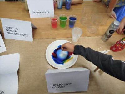 Podczas zajęć dzieci uczestniczyły w różnorodnych eksperymentach, m.in. „tęcza z cukierków”, „uciekające kolory”, „chodząca woda” oraz doświadczeniach związanych z gęstością cieczy i napięciem powierzchniowym. Uczniowie mieli możliwość samodzielnego wykonywania doświadczeń oraz obserwowania zachodzących zjawisk.