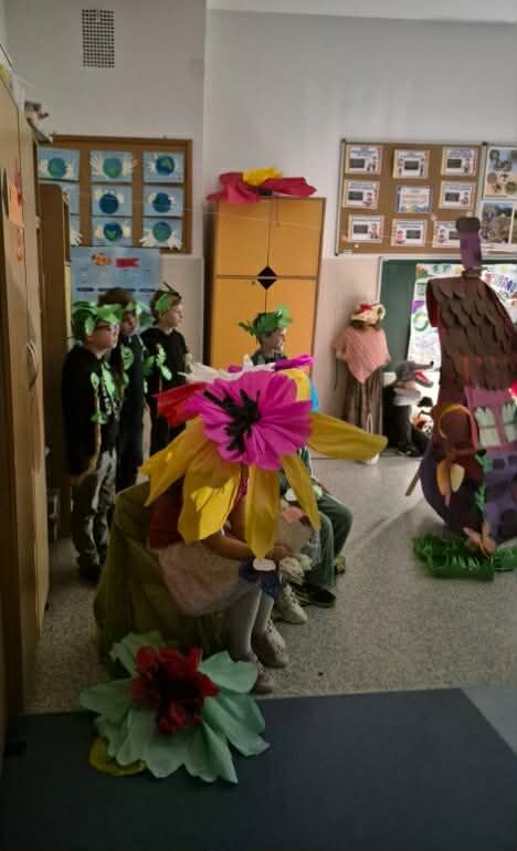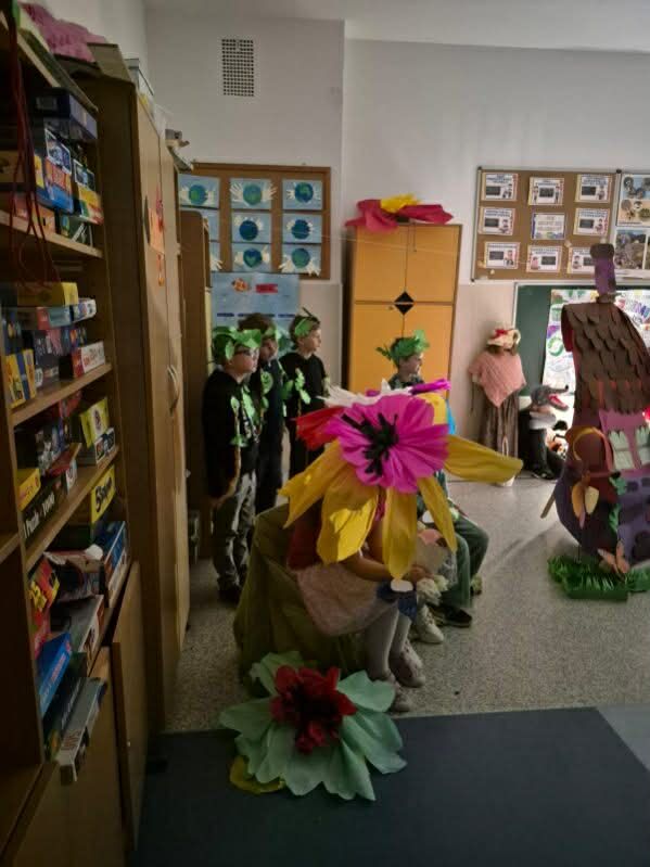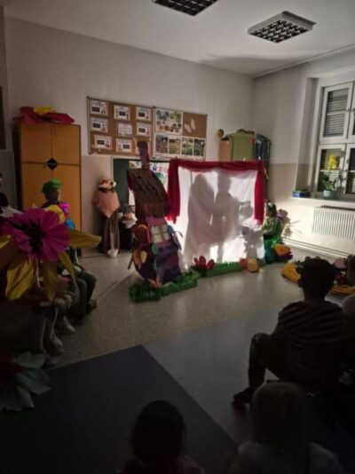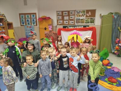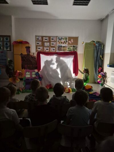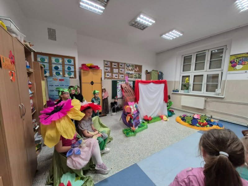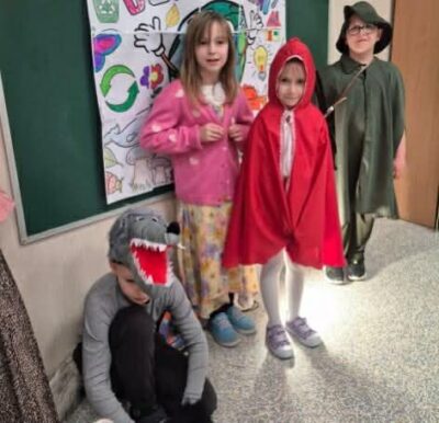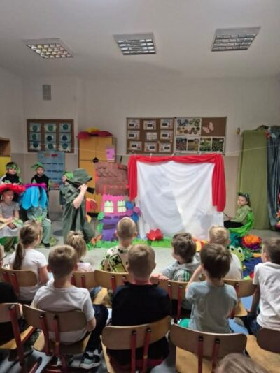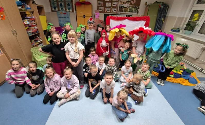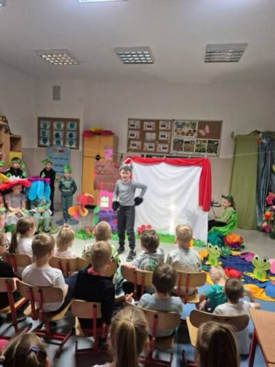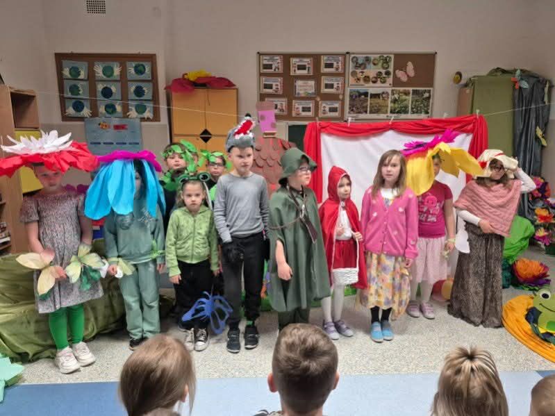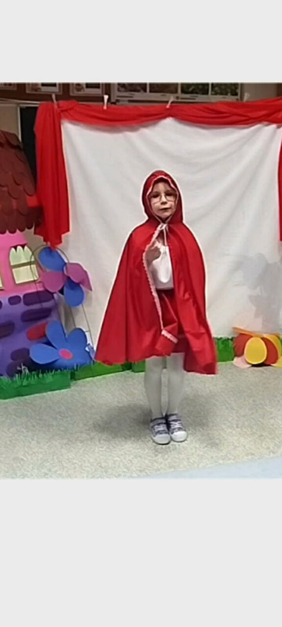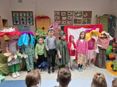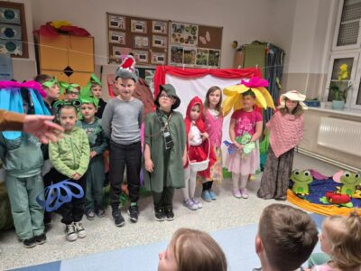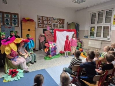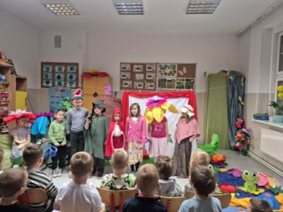 Uczniowie klasy 1 przygotowali i zaprezentowali teatrzyk „Czerwony Kapturek” dla kolegów z klas 2 i 3 oraz przedszkolaków. Młodzi aktorzy z dużym zaangażowaniem wcielili się w swoje role, tworząc miłą i radosną atmosferę. Przedstawienie nie tylko dostarczyło widzom wielu wrażeń, ale również przypomniało o ważnych zasadach bezpieczeństwa – szczególnie w kontaktach z nieznajomymi oraz o konieczności słuchania dorosłych.