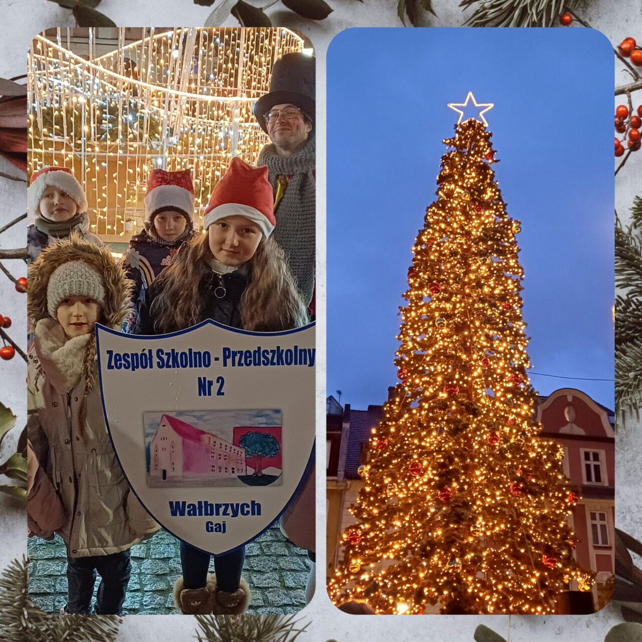 Tradycyjnie Wałbrzych  5.12 wszedł w świąteczny czas.  O  godzinie 16:00, na miejskim Rynku odbyło  się uroczyste zapalenie choinki – wydarzenie, które od lat przyciąga mieszkańców i symbolicznie otwiera grudniowy sezon w mieście. Jak co roku impreza ta jest też miejscem spotkania się dzieci ze wszystkich wałbrzyskich szkół. Nasza placówkę reprezentowała spora grupka dzieci wraz z rodzicami.