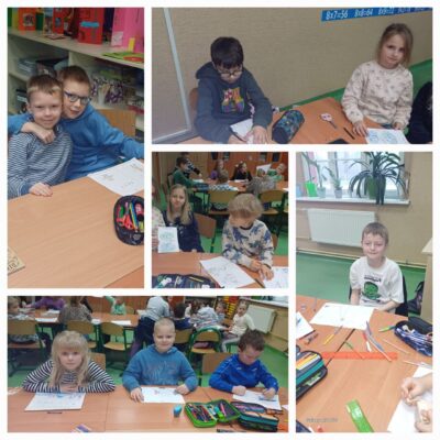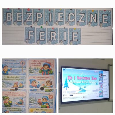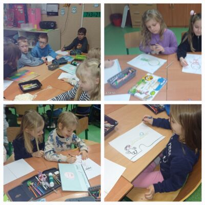 W ramach programu “Witaj w szkole” odbyły się kolejne zajęcia uczniów i przedszkolaków. Tym razem tematem były bezpieczne ferie. Dzieci obejrzały film edukacyjny “Ania i bezpieczne ferie”. Rozwiązywały wspólnie quiz – starsze dzieci czytały pytania i możliwe odpowiedzi, a przedszkolaki wybierały prawidłowa odpowiedź.KW kolejnym etapem było zilustrowanie zdobytej wiedzy.